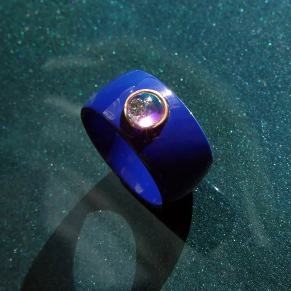 Magma kerámia királykék 58-as méretben – különleges fényes anyag 2200c magasságban olvad és a gyémánt keménységétől csak 1 el marad el. Büszkén kijelenthető, hogy keményebb mint bármilyen fém foglalat így nem törik el és nem karcolódik sosem! A gyűrű felső közepébe látható a Megcsiszolt fény Róth Miksa türkiz üvegében kék magenta tökör ágyon az 1,9mm Vs tisztaságú rózsaszín gyémánt úszik. Örökre szóló szerelemnek. szélessége 1,1cm gyűrű belső átmérője 1,9cm