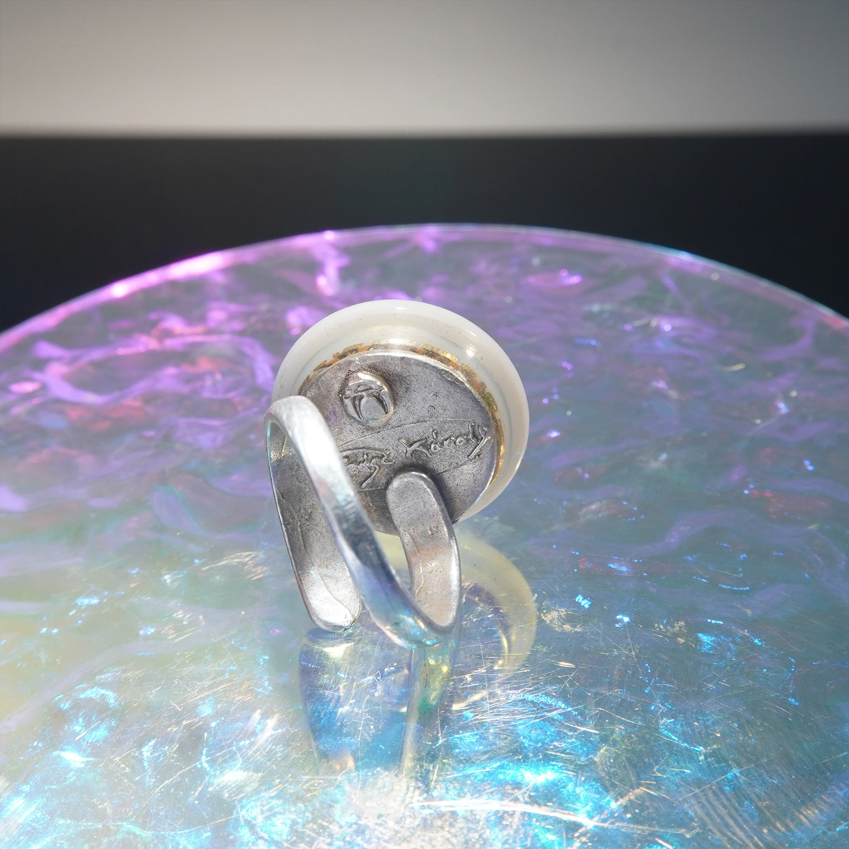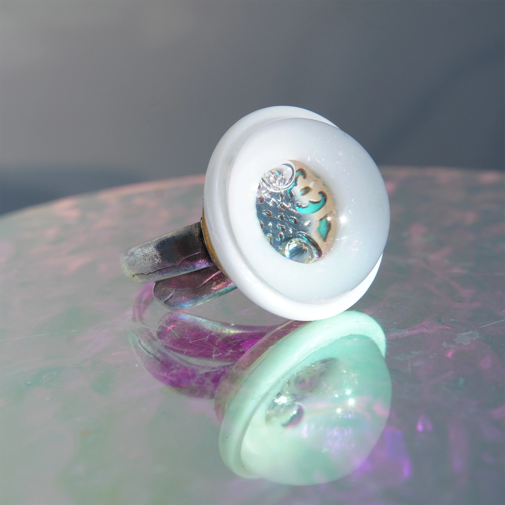 Róth Miksa opalin fehér üvegéből készült gyűrű mely köré a Magma ceramic glória gyűrű fonódik. Az anyag ütésálló kopássálló és szinte törhetetlen .