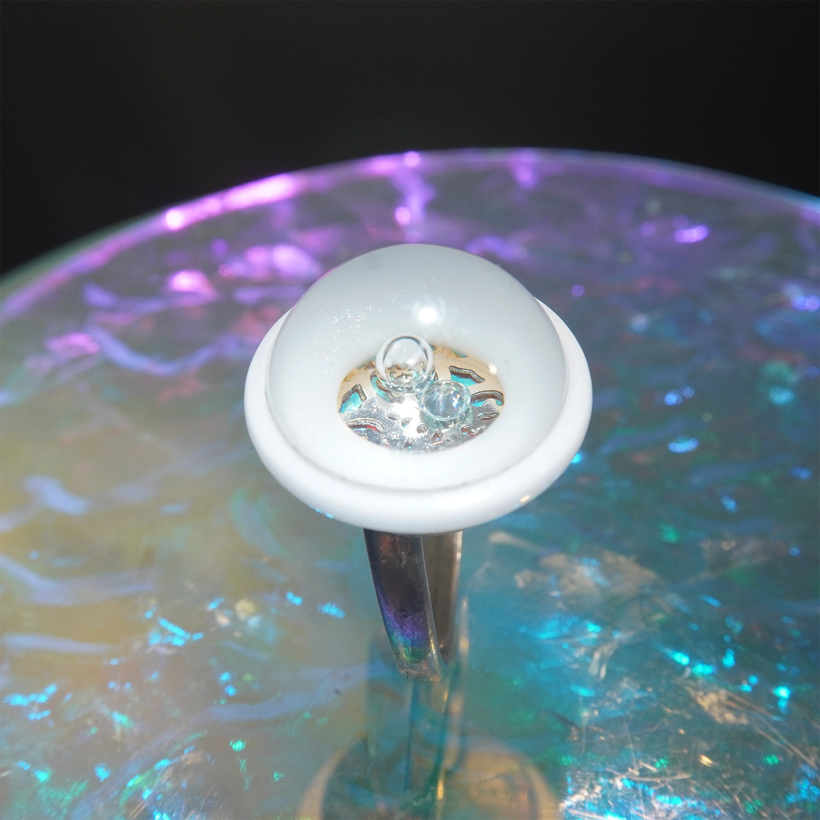 Az üveg belső terében vidám buborék es egy Vs1 -es tiszta gyémánt úszik. 2mm nagyságú. A gyémánt alatt ezüst lap vésett mintával alatta kékesen ragyog a tükörágy.