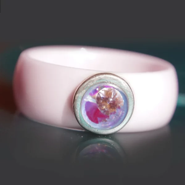 Magma kerámia rózsaszínben 59-as méretben – különleges fényes anyag 2200c magasságban olvad és a gyémánt keménységétől csak 1 el marad el. Büszkén kijelenthető, hogy keményebb mint bármilyen fém foglalat így nem törik el és nem karcolódik sosem! A gyűrű felső közepébe látható a Megcsiszolt fény Róth Miksa türkiz üvegében kék magenta tökör ágyon az 1,9mm Vs tisztaságú rózsaszín gyémánt úszik. Örökre szóló szerelemnek. szélessége 0,9cm gyűrű belső átmérője 1,8cm