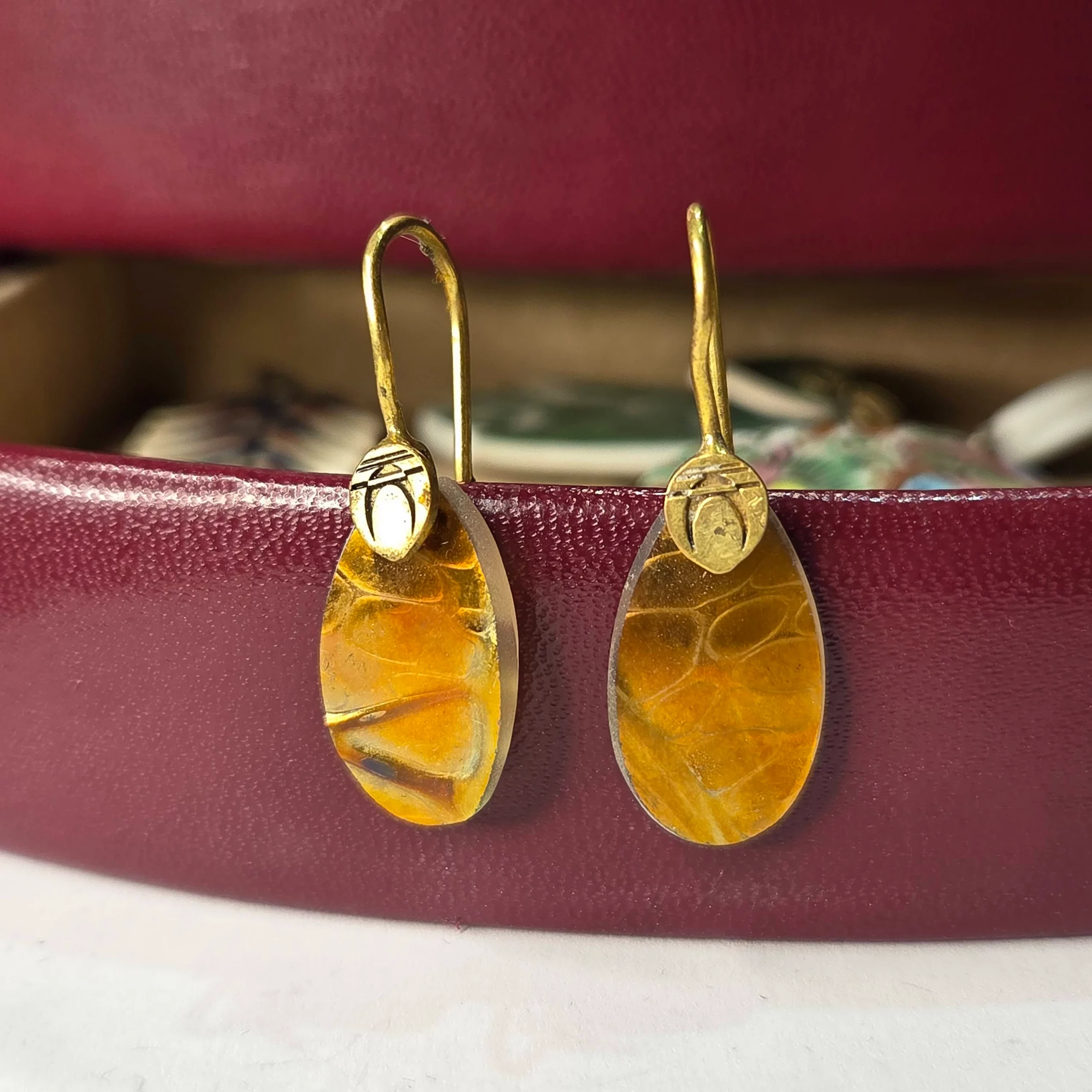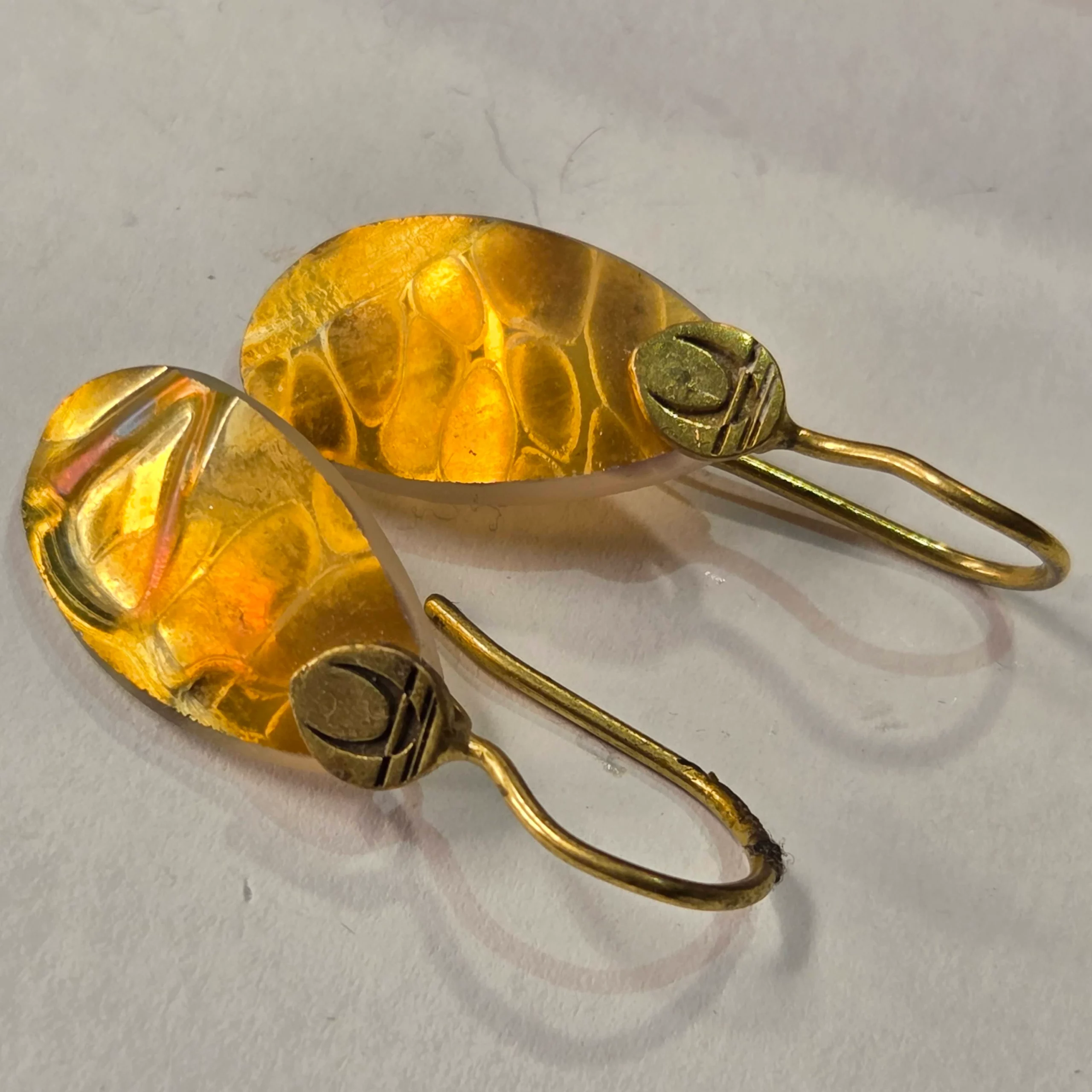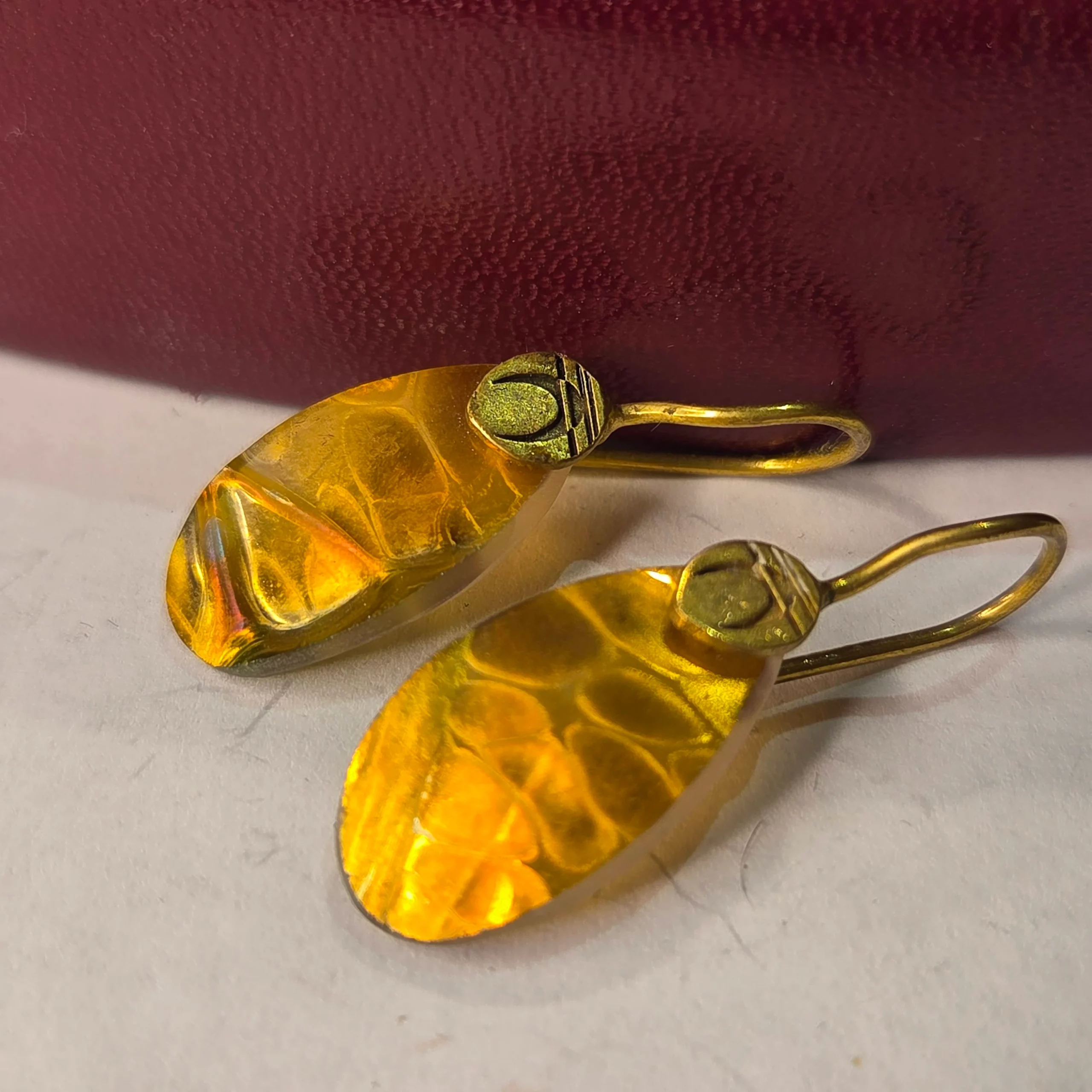1890-es évek szecesszió irizáló Loetz üveg vázájának ragyogó darabkája gondosan megcsiszolva fülbevalónak .2,3cm Logózott Peengős79 tiszta ezüst tartalmú akasztóval.