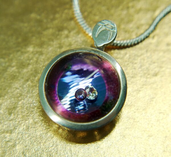 A Mátyás Templom üveg ablakának a darabjából csiszolt medál eredeti 2 mm nagyságó VS2 -es úszó táncoló gyémánttal. A mélykék,lila és aranyba forduló tükörágyon színekkel játszó jelenet jön létre a szférikus belső világban. A képen látható ajándék lánccal küldöm!