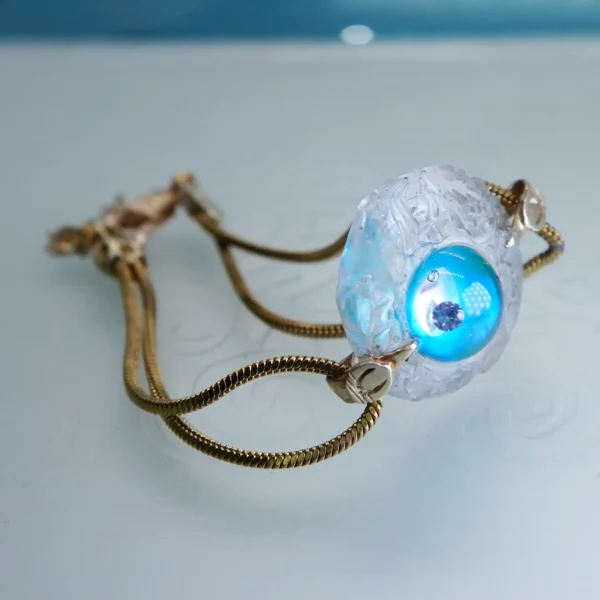 A külső áttetsző foglalat mérete 2,4cm átm. , és a belső foglalatban a Mátyás Templom ég kék üvegében 2mm nagyságú VS1-es tiszta gyémánt táncol a buborékkal egy kék magenta tükörágyon. A karkötő ékszer acél lánccal van ellátva 16,5cm-21cm csukló méretig lehet hordani de bővíthető a mérete ha szükséges. Logóval ellátott Pengős79-es akasztóval mely 790% ezüstöt tartalmaz.