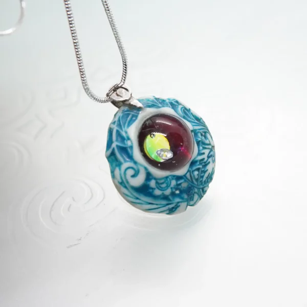 A  külső áttetsző foglalat mérete 2,4cm átm. , és a belső foglalatban a Mátyás Templom meggyszínű üvegében 2mm nagyságú VS1-es tiszta gyémánt táncol a buborékkal egy kék magenta tükörágyon. Logóval ellátott Pengős79-es akasztóval mely 790% ezüstöt tartalmaz.  A medálhoz hozzá illő láncot küldök.