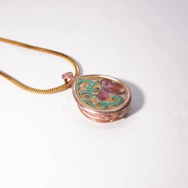 Az antik Qing-dinasztia kori kantoni rózsa medálion (rose medalion ) vázából csiszolt rózsafestmény. Lenyűgöző kínai mintákkal figurákkal, sárkányokkal pillangókkal úrihölgyekkel díszített porcelánváza, melyet bonyolult rózsa- és madárdíszek díszítenek, a Qing-dinasztia idején készítettek (1900 as évek eleje). Élénk, többszínű palettájával és figurákkal díszített vázájával a kínai fazekasság kifinomult kézművességét és művészi érzékét mutatja be. Nemesi bronz foglalatban dúsan aranyozva.2,2cm átmérőjű.