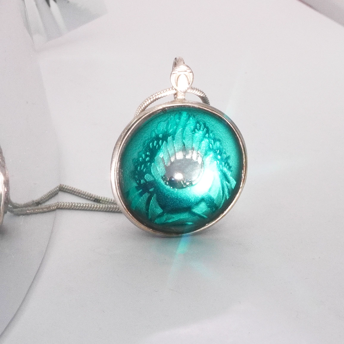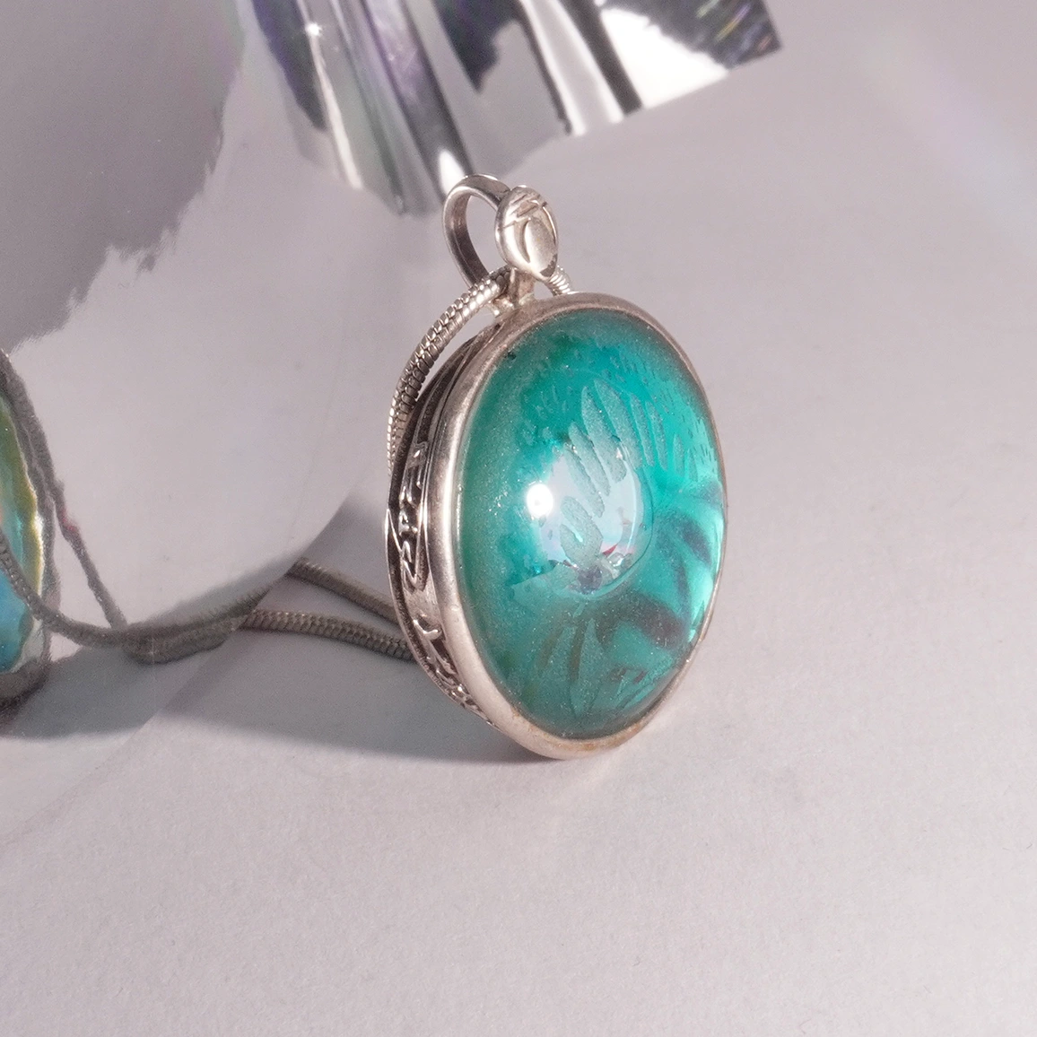 A medál antik üvege opalin türkizkék, Róth Miksa hagyatékából származik, belső kerengőjében élettel teli kék gyémánt 1,8mm, és megannyi kék nyers gyémánt táncol egy buborékkal. Alattuk ezüst tükörágy vetíti be a fényt a gyűrű belső terébe. A foglalat átmérője 2,5cm, szignált, Pengős79 es anyag azaz 790 ezrelék ezüstöt tartalmaz, antiallergén.Az optikai védőlencsét Napier városának ArtDeco motívumai szerint homokvéstem. A medál mellé ezüstözött acél láncot küldök.