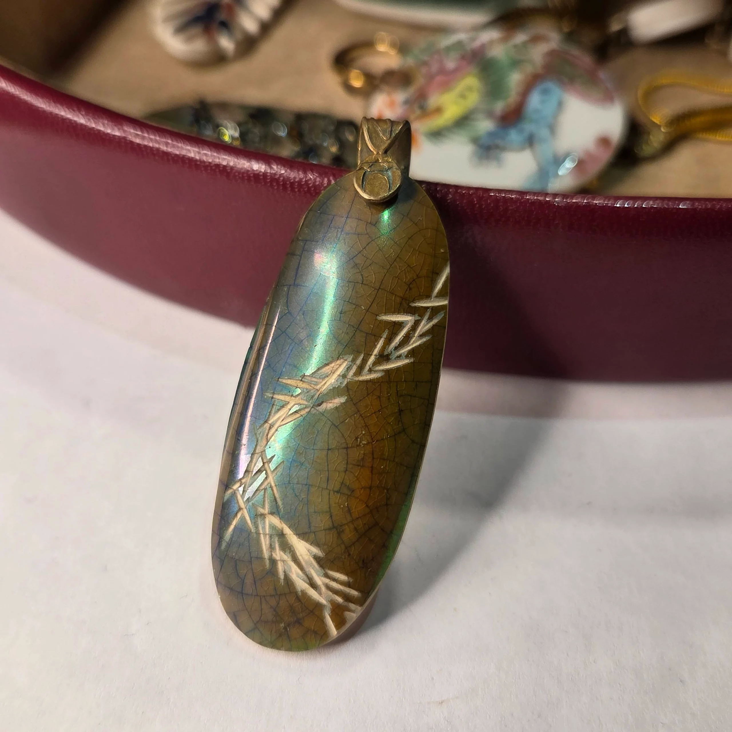 Antik Zsolnay (1930) eozin vázából megcsiszolt medál , lépéseket útvonalakat szimbolizáló gyémánt csiszolással vésett .