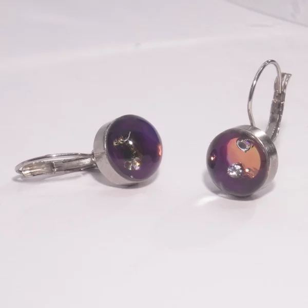„Megmenteni a Megmenthetőt” a mai napig ez az ékszerek mondanivalója. Mátyás Templom üvegét az 1944 es bombázások előtt kibontották és innen származó püspök lila üveg darabkát használtam fel ebben a fülbevalóban . A Megcsiszolt Fény ékszerekre jellemzően a belső misztikum itt is látható 2mm nagyságú gyémánt úszkálgat a buborékkal . Lila és aranyba forduló fénytükör felett táncra perdül a gyémánt a buborékkal. A fülbevaló hátulján a logóm jelenik meg. Aranyozott orvosi acél a foglalat így fémalalergia mentes.