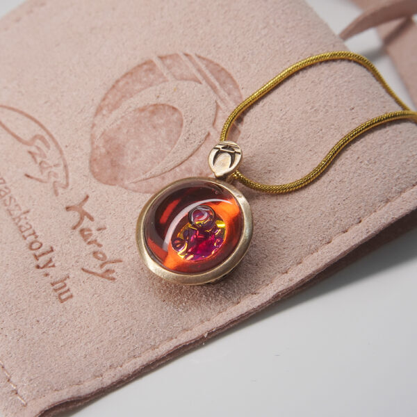 A Mátyás Templom üveg ablakának a piros darabjából csiszolt medál eredeti 2mm nagyságú princess azaz négyzet alakú galambvér színű madagaszkári rubinnal és egy vidám táncoló buborékkal .Körülöttük sok apró 1mm gömb rubinnal. Minden úszik mozog a szférikus belsőben. A képen látható ajándék lánccal küldöm!