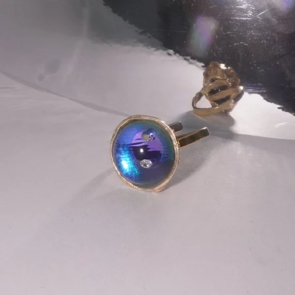 A Mátyás Templom üveg ablakának a darabjából csiszolt gyűrű eredeti 2 mm nagyságú VS2 -es úszó táncoló gyémánt látható és egy buborék.  A szférikus terében szinte világít az ég kékes türkizes magenta tükörágy és így megragyogtatja az üveget és a belső kincset. A foglalat átmérője 1,4cm vastagon aranyozva és anti allergén nemesi bronz . A gyűrű szabadon aprótól a nagy méretig állítható.