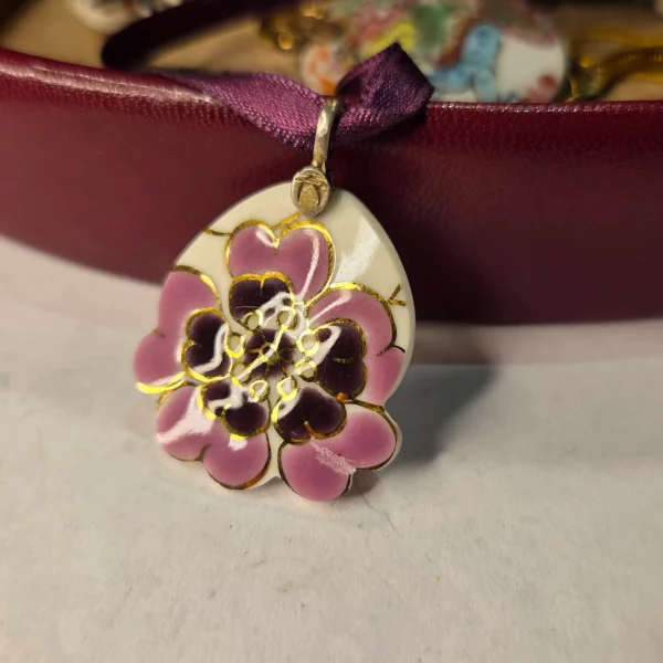 Antik Zsolnay kéttüzű (1930) szelőrózsa mintás vázából megcsiszolt porcelánmedál 3,5x3cm Logózott Peengős79 tiszta ezüst tartalmú akasztóval.