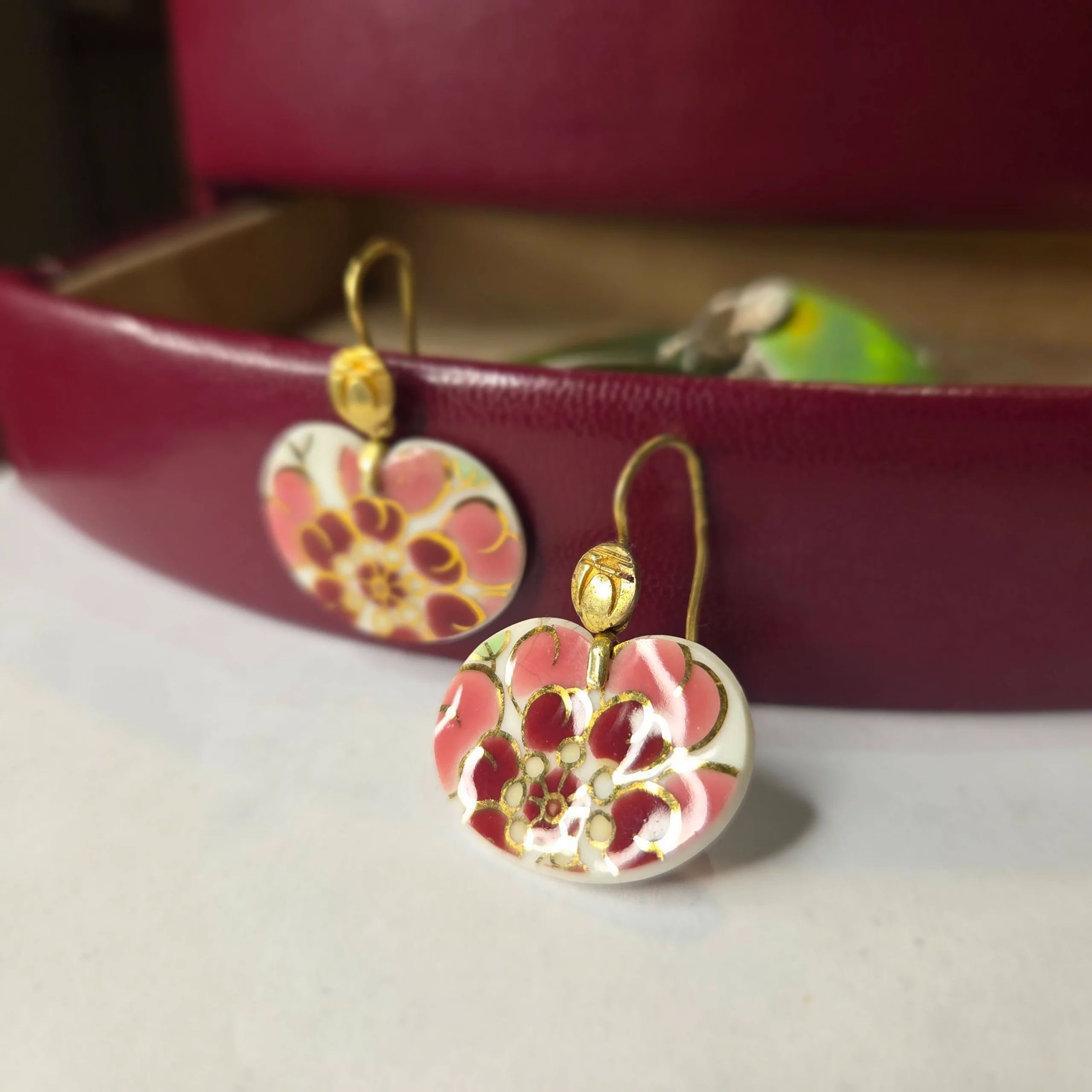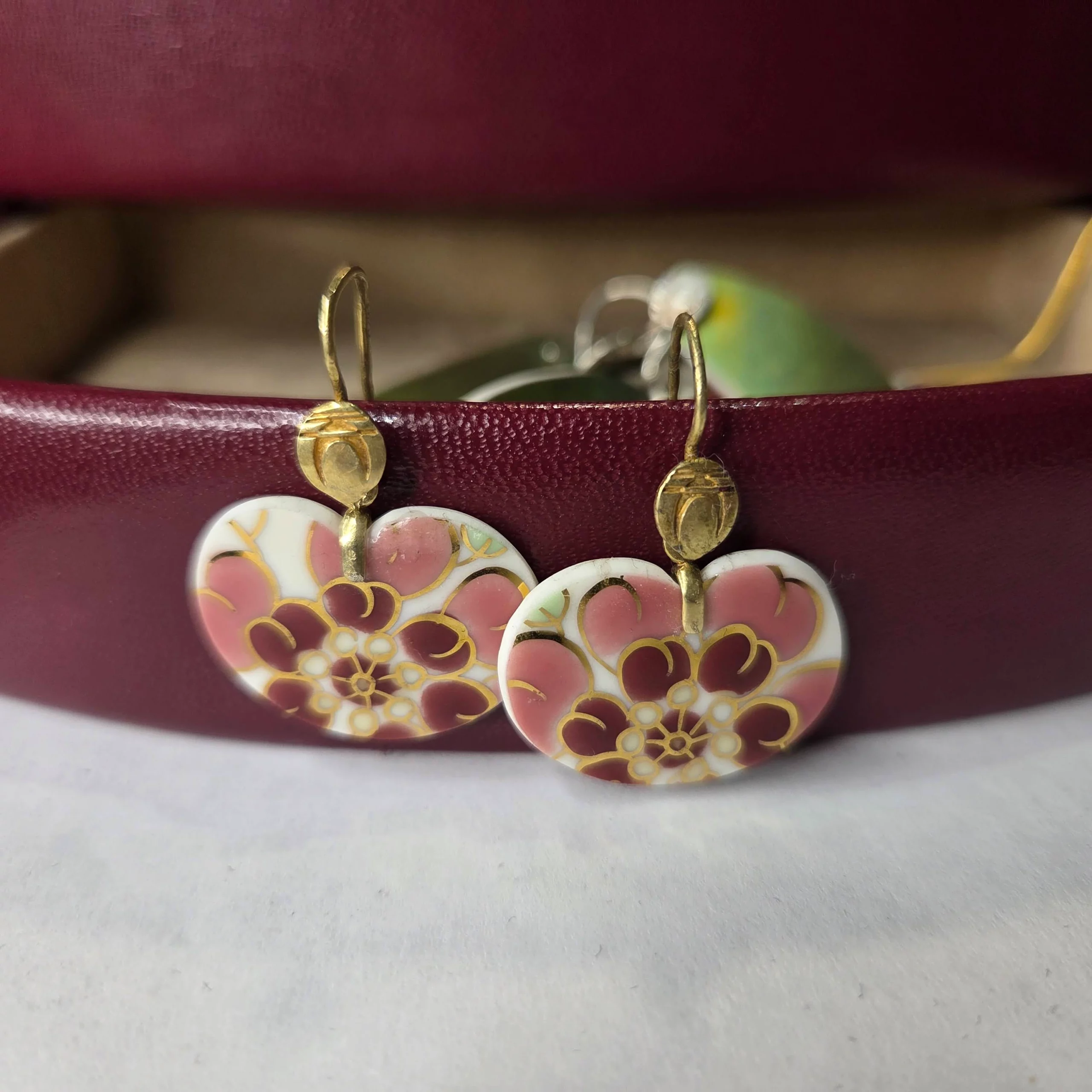 Antik Zsolnay kéttüzű (1930) szelőrózsa mintás vázából megcsiszolt porcelán fülbevaló 2×2,5cm Logózott Peengős79 tiszta ezüst tartalmú akasztóval.