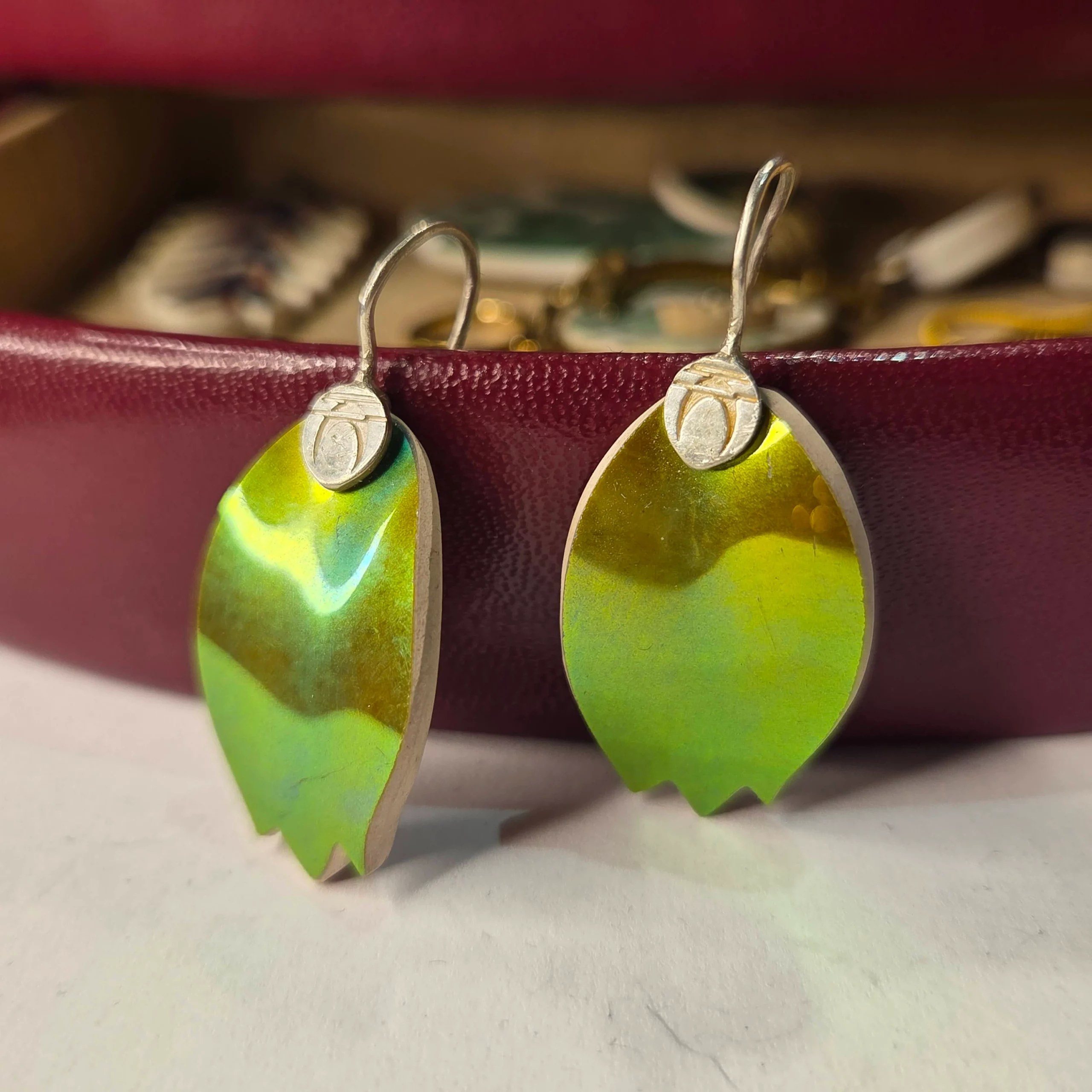 Zsolnay eozin paradicsomos vázának öböl szerűen csurgatott mélymázas hajlatából csiszolt fülbevaló  tulipánvég formára csiszolva az 1940-es évekből. 3x2cm Logózott  Peengős79 tiszta ezüst tartalmú akasztóval.