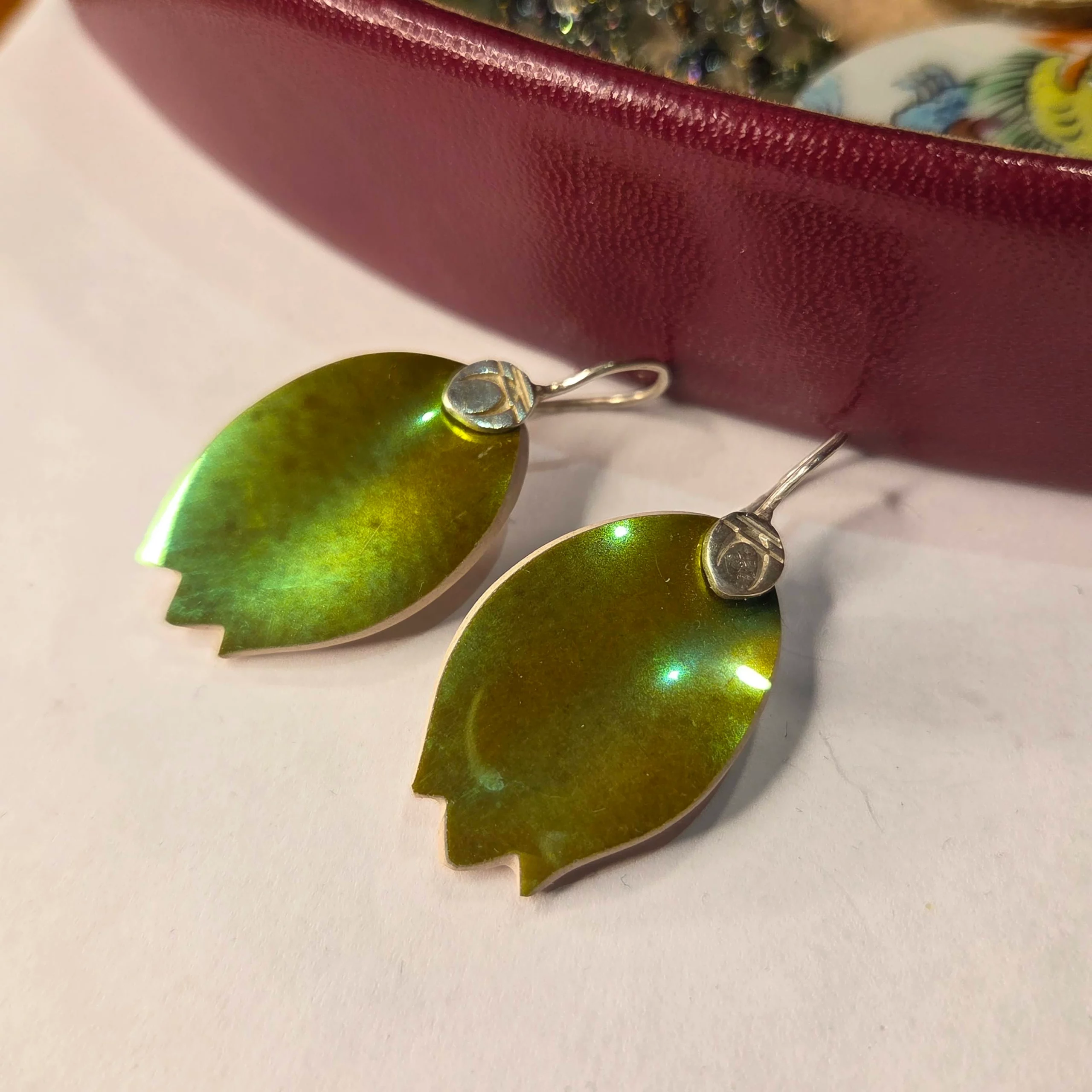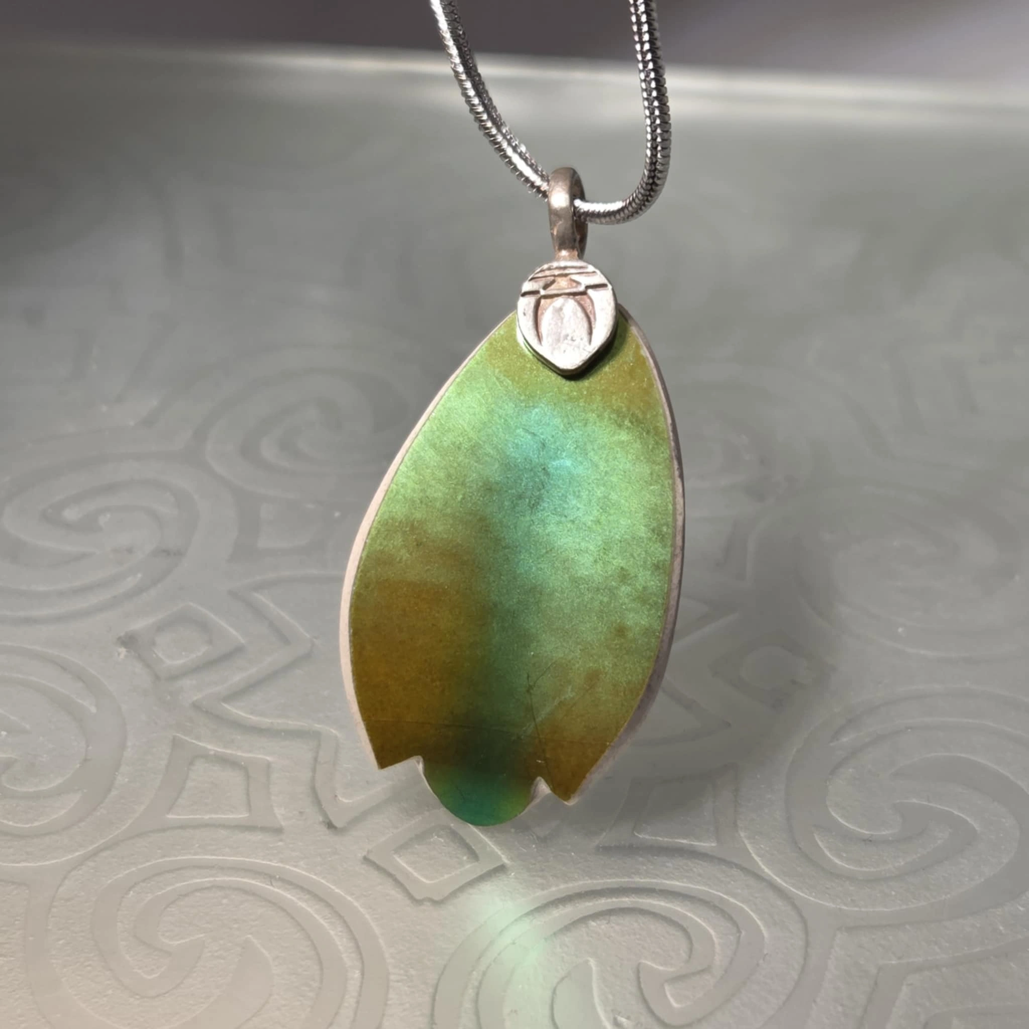 Zsolnay eozin paradicsomos vázának öböl szerűen csurgatott mélymázas hajlatából csiszolt medál tulipánvég formára csiszolva az 1940-es évekből. 3x2cm Logózott Peengős79 tiszta ezüst tartalmú akasztóval.