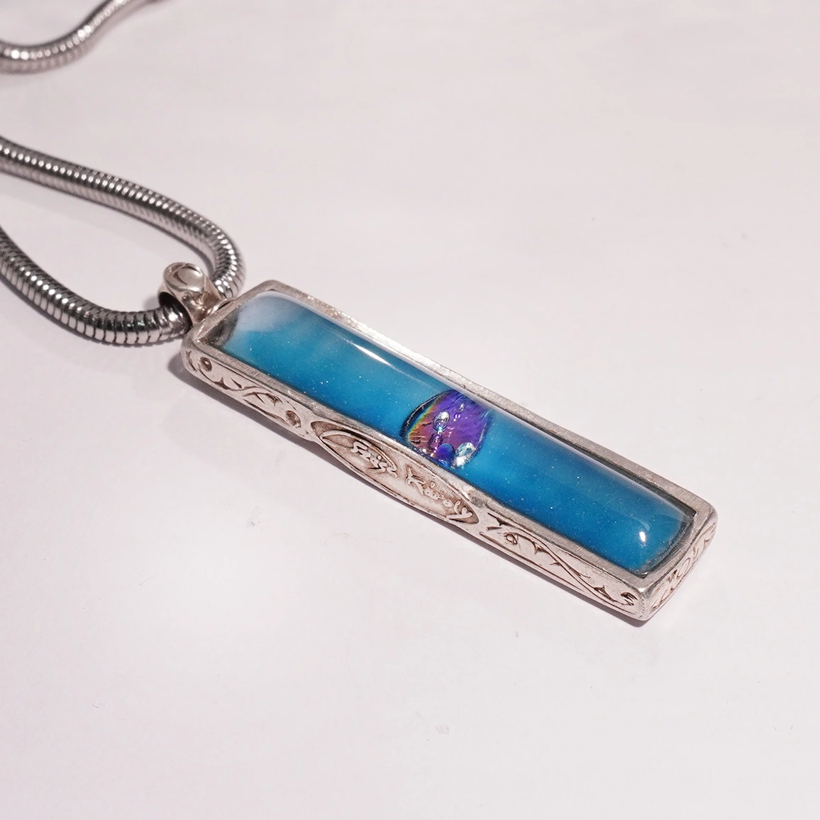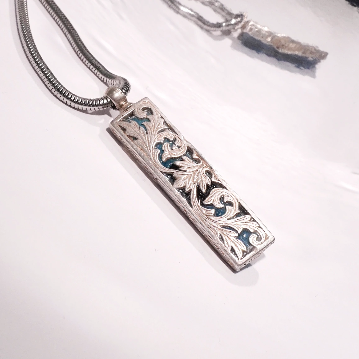A foglalat mérete nagyobb,1,2x5cm Reneszánsz mintára kézivésett ornamentika burjánzik nemesi bronz anyagból ami antiallergén. Vastagon ezüsttel bevonva így nem sötétedik nem oxidál a medál. Ezüstözött acél lánccal küldöm.